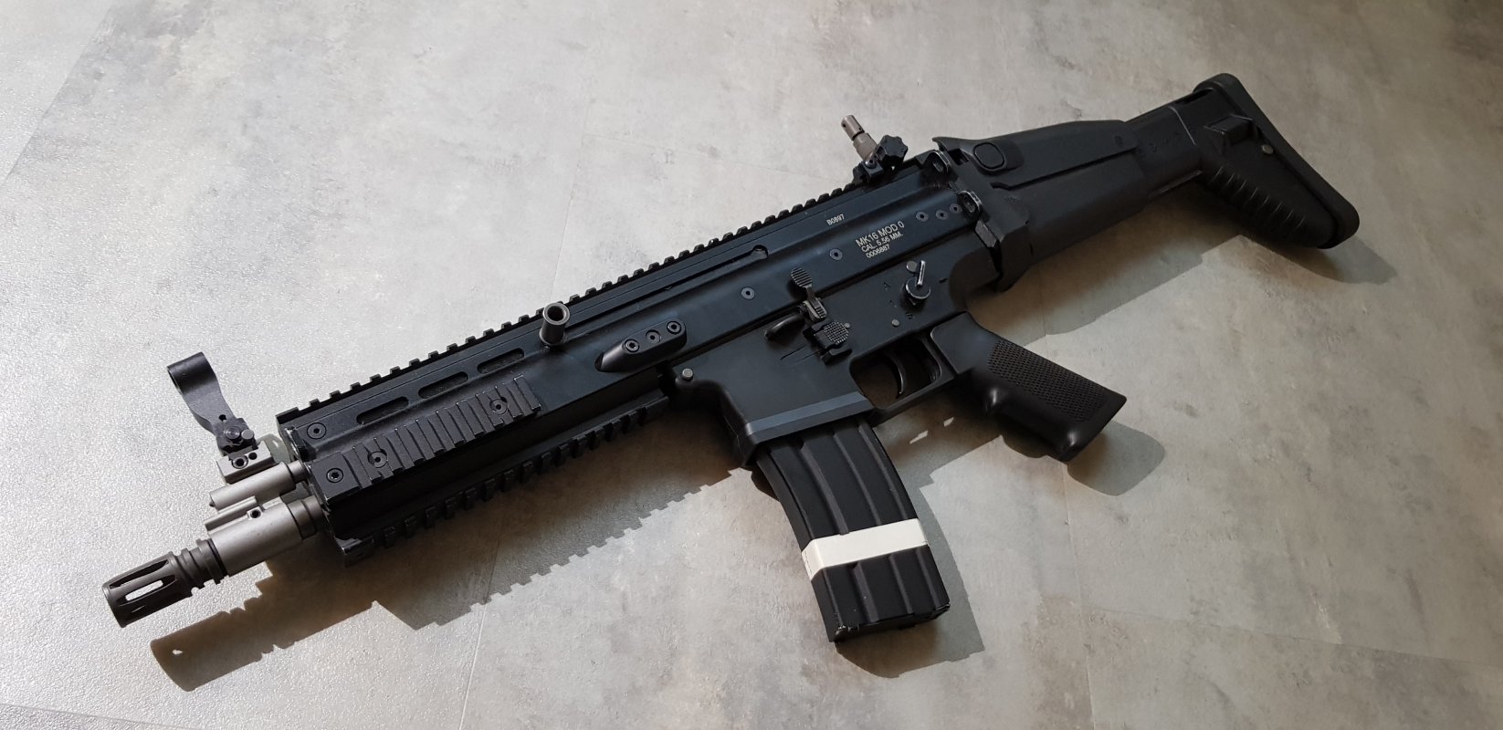 | Reálná předloha: FN SCAR (neboli Special Forces Combat Assault Rifle) nebo SCAR je útočná puška, která má v americké armádě (prozatím hlavně u speciálních jednotek) nahradit pušky M16 (Mk 18), M4A1 (Mk 18), M14 DMR (Mk 18), CQBR (Mk 18) a SR 25 (Mk 11).[1] Komplet SCAR (česky: bojová útočná puška pro speciální operace) tvoří dvojice zbraní ve dvou rážích s 60% podílem shodných konstrukčních prvků a na 90% stejným ergonomickým uspořádáním. Do kompletu SCAR ještě patří 40 mm granátomet EGLM, připojitelný pod hlaveň obou zbraní nebo použitelný samostatně (s vlastní pažbou). | ||